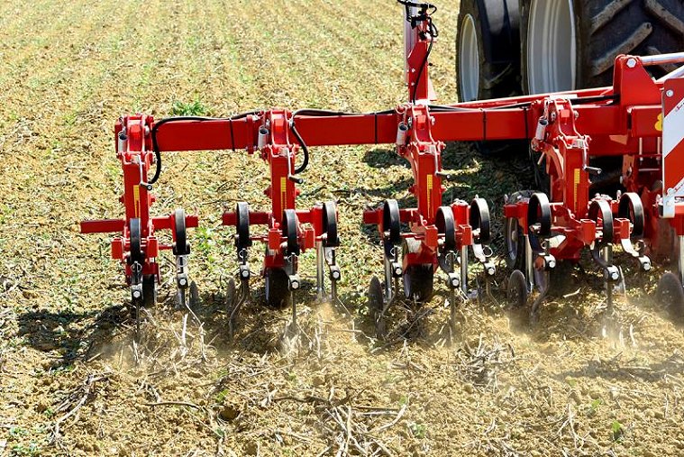 - A kapaelemek (pl. répa, szójabab, lóbab, kukorica stb.) 30 cm-es sortávolságtól a hosszú paralelogramma „alatt” helyezkednek el. Ennek az az előnye, hogy a kapatest és a kapák jobban behúznak, még erősen kérgesedett, kemény talajon is. Az emelőerő tehát kisebb, és kisebb nyomás szükséges a kapákra, mintha a kapák a paralelogramma "mögött" helyezkednének el. Ezenkívül egy három fokozatban állítható behúzórugó garantálja, hogy a kapatestet behúzza a talajba és megtartja a beállított munkamélységet.