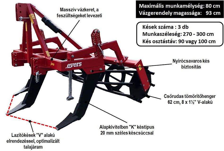 Egyedülálló:Az Evers számos kivitelben kínál késeket és késcsúcsokat. Ez biztosítja, hogy altalajlazítóink mindig megfelelő megoldást kínáljanak az Ön szántóföldjére. Vannak olyan altalajlazítók, amelyek keverik a talajt, valamint olyanok is, amelyek a talajrétegek keverése nélkül lazítják a talajt. Minden Evers altalajlazító V-alakban elrendezett késekkel rendelkezik. Ezek biztosítják az egyenletes és rendkívül hatékony talajlazítást minimális vonóerőigény mellett, valamint az optimális, egyenletes talajáramlást, még a nehéz növényi maradványokkal és nagyon nehéz talajokkal rendelkező területeken is. Az Evers altalajlazítók alapfelszereltségként nyírócsavarokkal vannak felszerelve; hidraulikus kőbiztosítás kérésre elérhető.