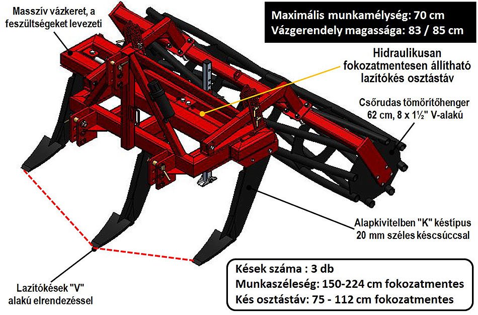 | Típus | Kések száma | Munkaszélesség | Késtávolság | Gerendelymagasság | Munkamélység | Teljesítmény igény | Függesztés | Vázkeret | Szállítási szélesség | Súly |