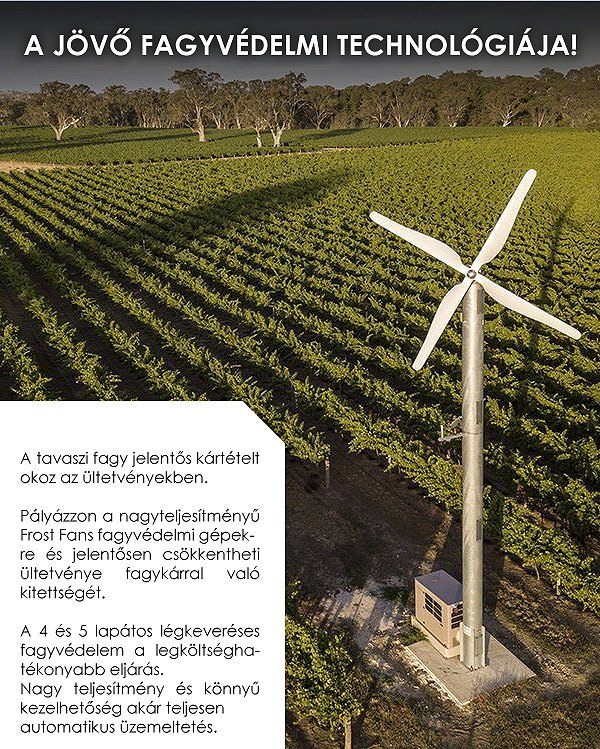 A "Frost Fans" fagyvédelmi szélgépei 4 és 5 lapátos egyedülálló technológiája révén lényegesen kevesebb energiafelhasználás és jelentősen kisebb zajkibocsátás mellett nagyobb területet védenek meg, igazodva az egyre szigorúbb környezetvédelmi előírásokhoz!