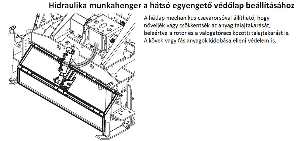 - Hátsó egyengető védőlap és törőrács a zúzott termékekhez, MECHANIKUS csavarorsó segítségével állíthatók