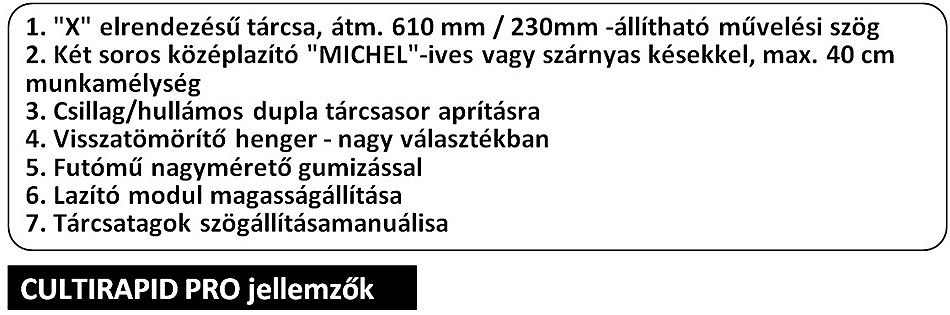 A «Cultirapid Pro» egy kombinált gép a talaj művelésére és a magágy előkészítésére, konzervatív kultúra szerint, szántás nélküli talajra tervezve, a Min Till jellemzőivel összhangban. Alacsony művelési költségek, - akár 50%-os megtakarítás, művelési menetszámok csökkentése, talajok termőképességének fenntartása, növelése, optimalizált talajszerkezet