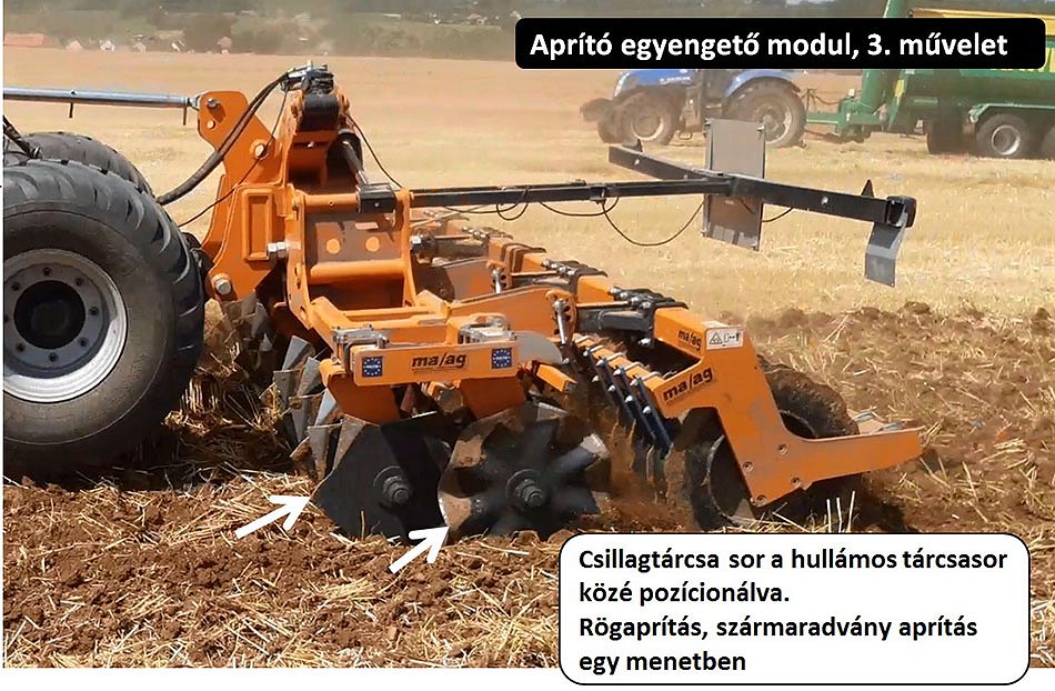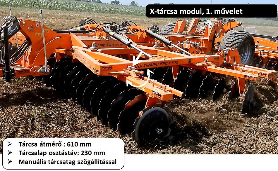 • Talajművelő modul, csipkézett X-alakban elrendezett első tárcsa, tárcsatagok kézi dőlésszög-állítással. A tárcsatengely lengő csapágyazásal,