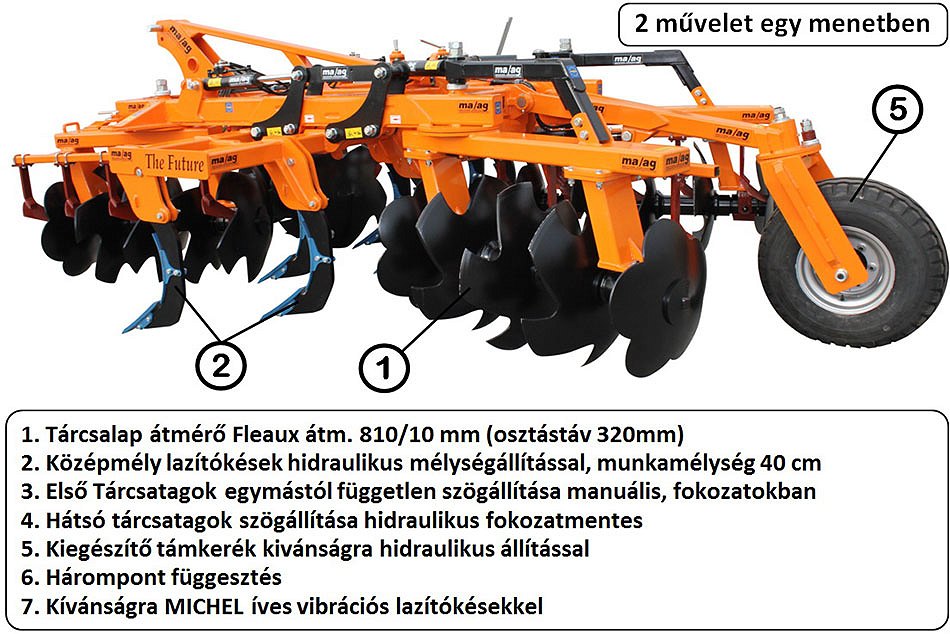 · Hátsó Flow tárcsák átmérője: 810 mm, vastagsága: 10 mm, hidraulikusan állítható. 40x40 mm-es négyzet alakú acél tárcsatengelyek. Lengő
