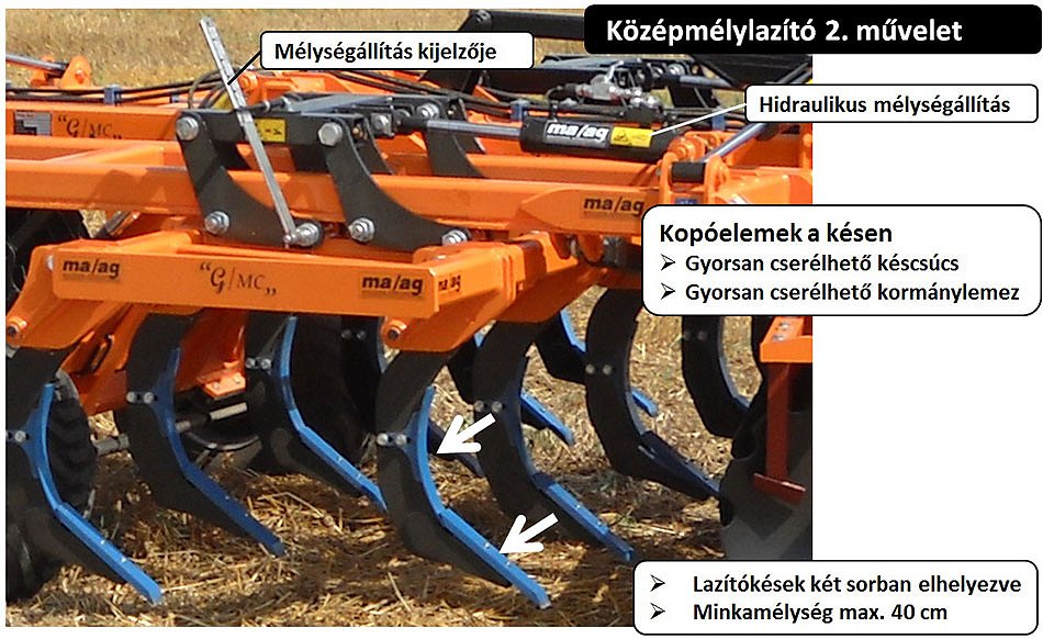 • 9 vagy 11 késsel és hidraulikus mélységszabályozással ellátott egység. A kések 2 munkasorban vannak elrendezve, nyírócsavaros