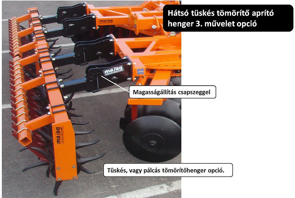 • Hátsó sima/csipkés tárcsák, 660 mm átmérőjű, 6 mm vastag, 230 mm tárcsatávolsággal. 40 x 40 mm acél tárcsatengelyen Lengő