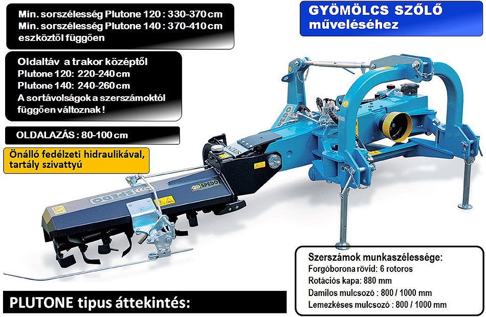 PLUTONE soraljművelő szerszámtartó párhuzamos önvisszahúzással. Nagy lombfákkal rendelkező gyümölcsösökhöz és minden soros ültetvényhez. FONTOSABB szerszámok: Rotációs kapa, Forgóborona, Damilos mulcsozó, Késes mulcsozó.