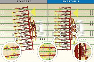 Az új SMART-HILL asszisztensrendszerrel A ROW GUARD kameravezérlés egy további dimenzióval bővül: egy további forgó tengely automatikusan kompenzálja a sorközművelő gép elsodródását és dőlését lejtőkön. Ezáltal először válik lehetővé a teljesen automatikus lejtőkompenzáció!